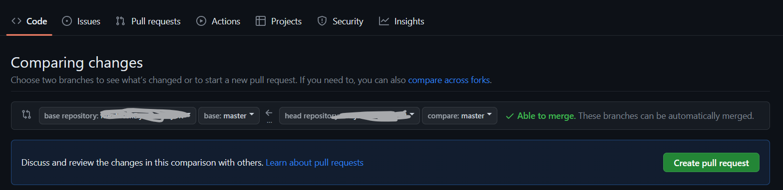 不出意外的话,如下显示 Able to merge, 点击 Create pull request 即可
